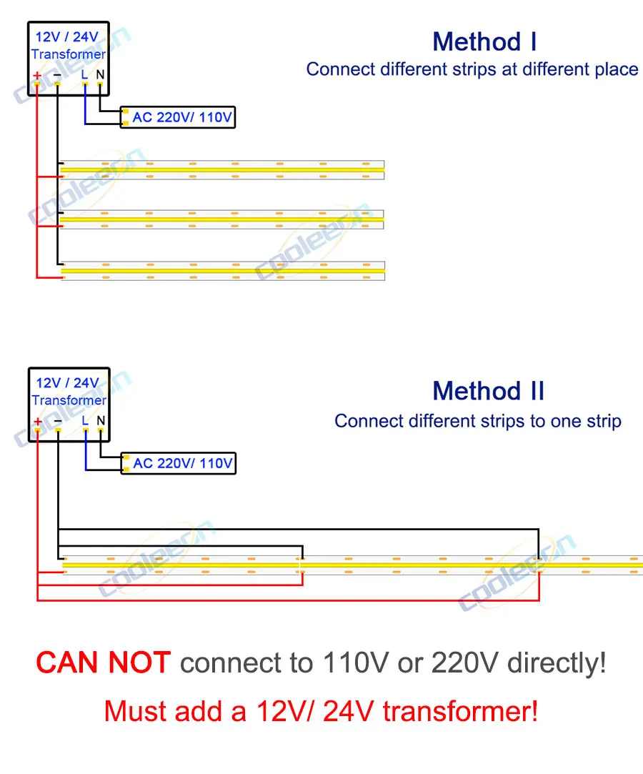 1. A tira precisa o transformador 12V ou 24V, não pode ser conectada a CA 110V ou 220V diretamente!