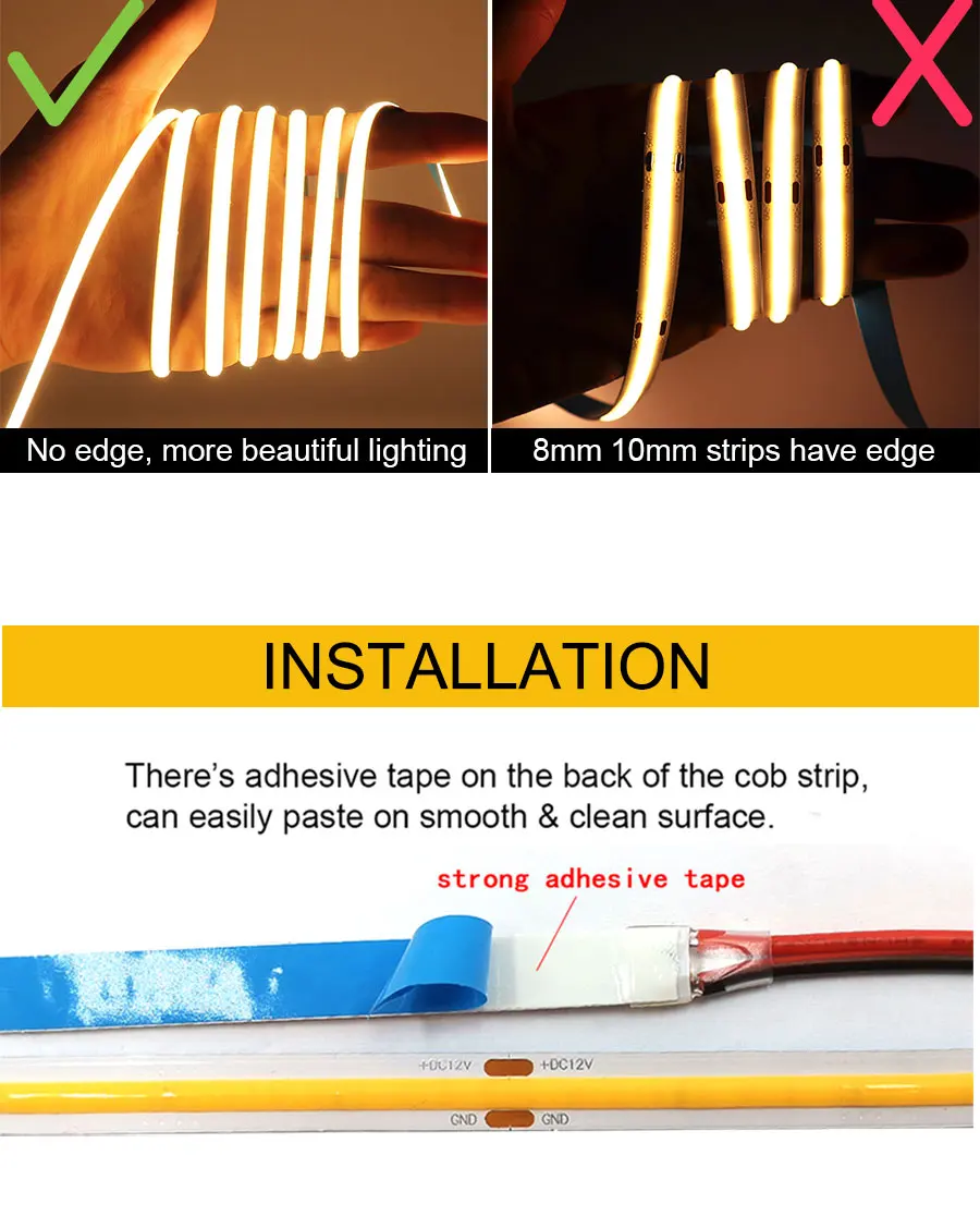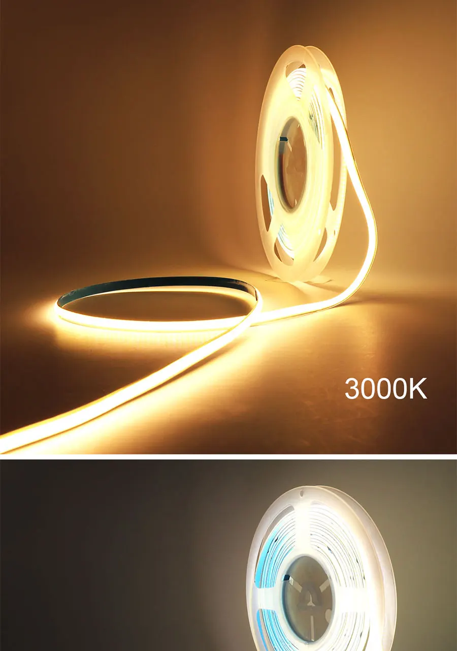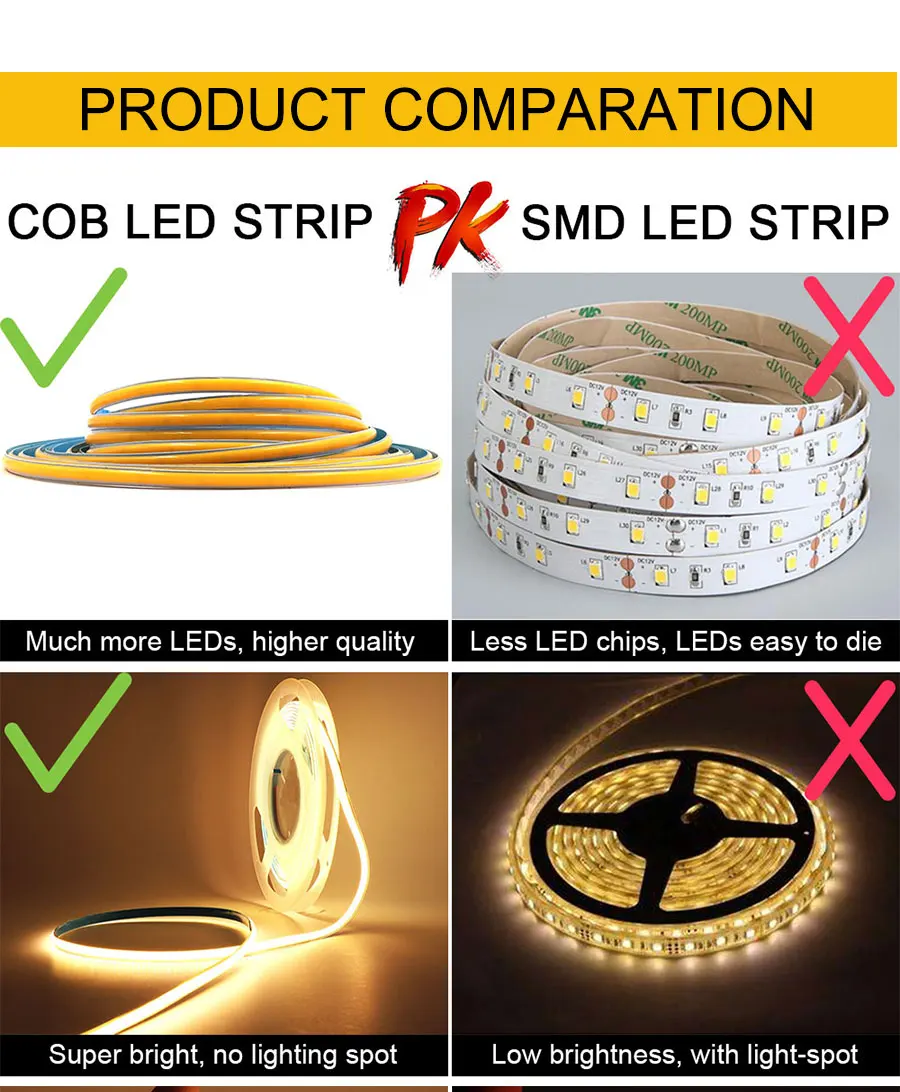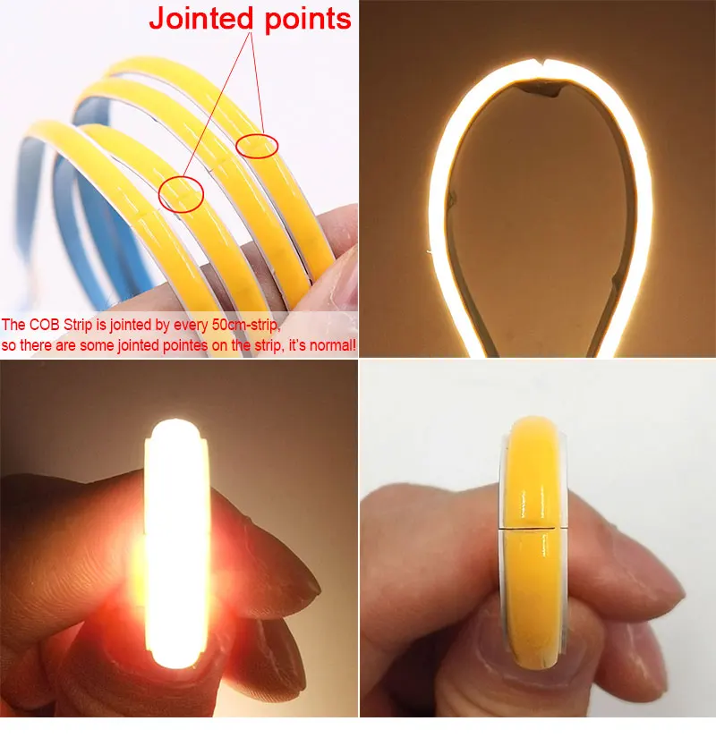 2. A tira COB é articulada por 50cm-strip, então há alguns pontos articulados (soldagem) na tira, é muito normal! Os pontos articulados não influenciarão o efeito luminoso!