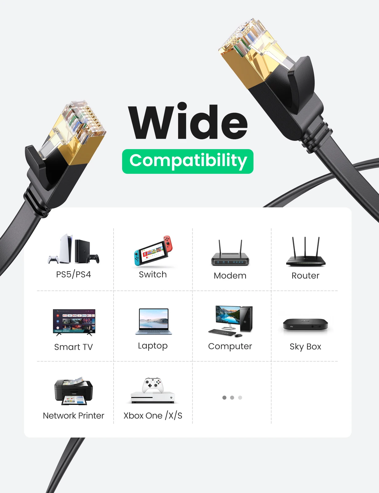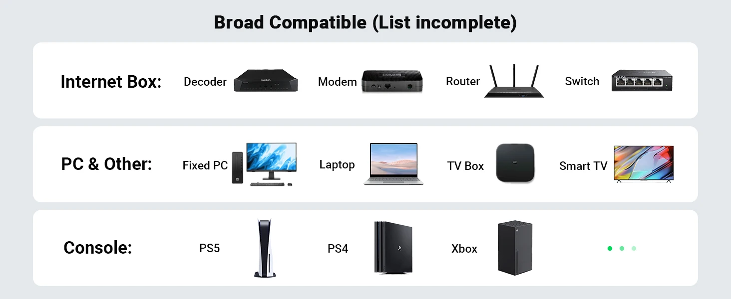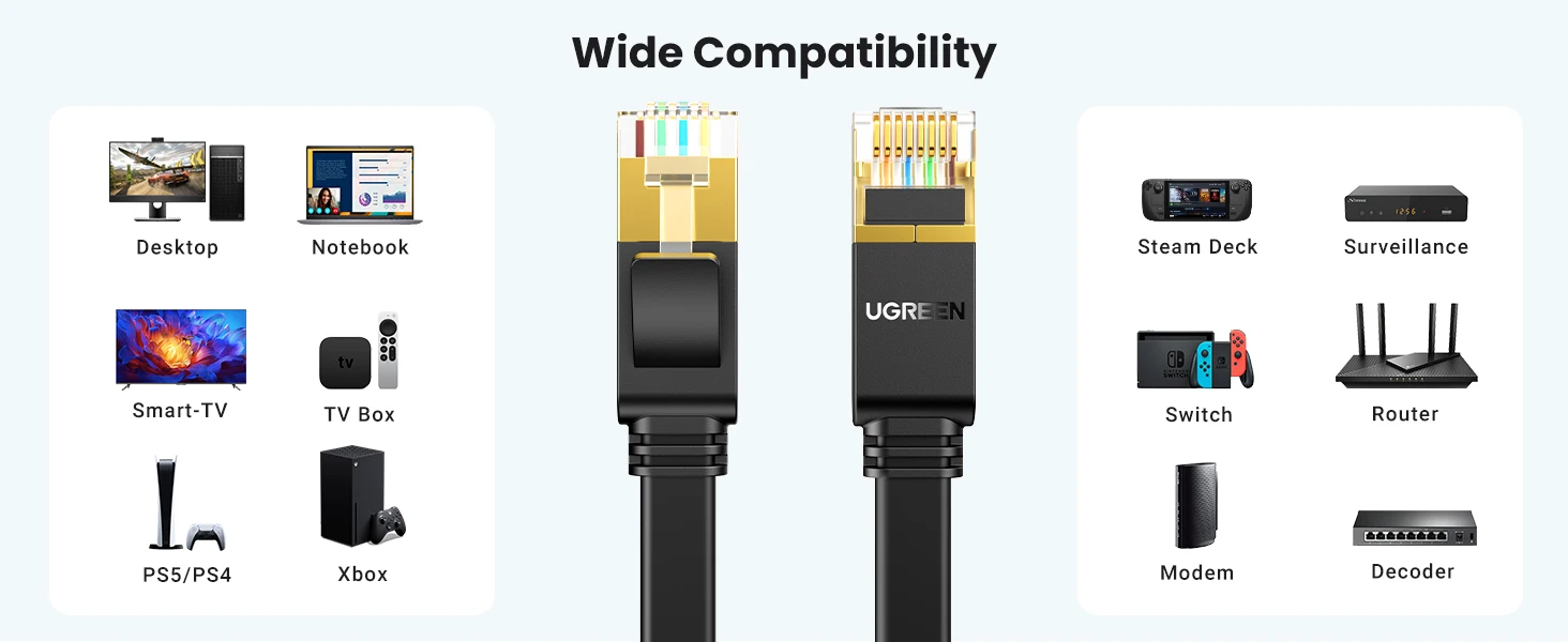 Este cabo de rede Cat7 é compatível com uma ampla gama de dispositivos, desde computadores e roteadores até consoles de jogos e Smart TVs. Seu conector RJ45 oferece encaixe perfeito e seguro, evitando desconexões acidentais e fornecendo uma conexão segura em todos os momentos.