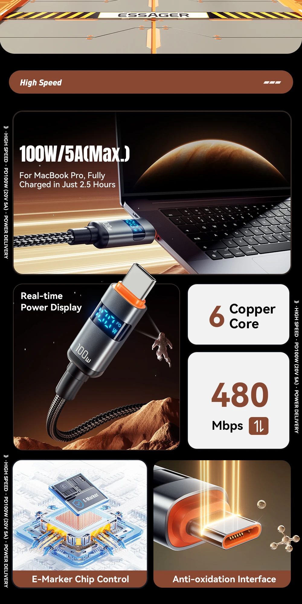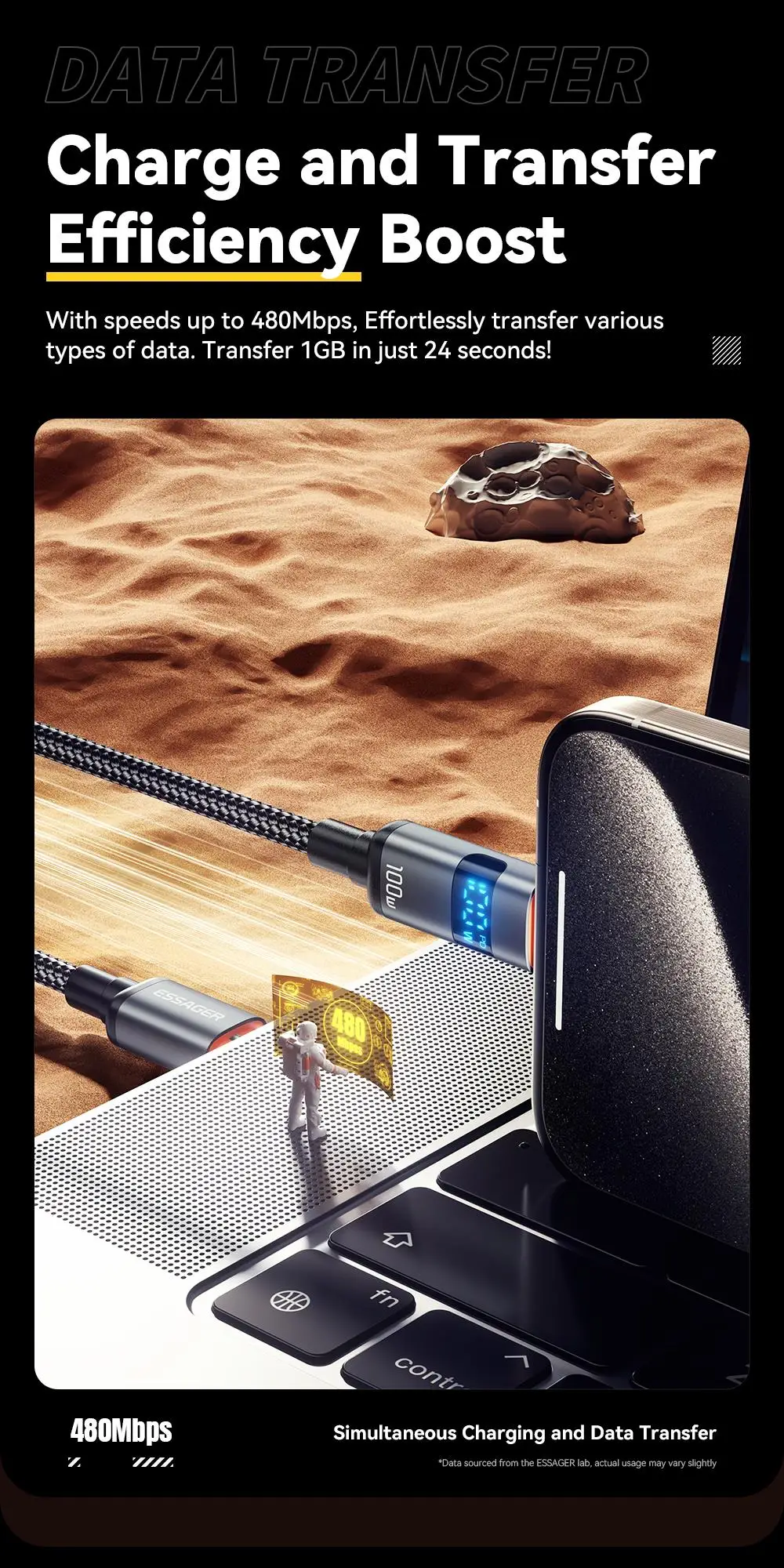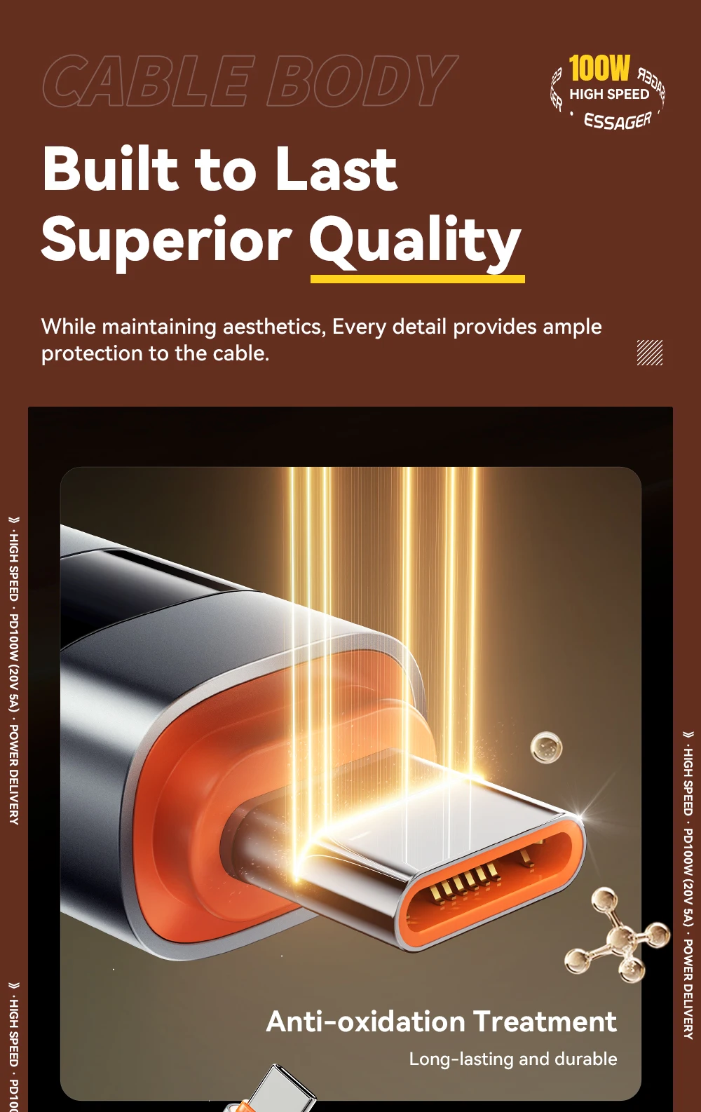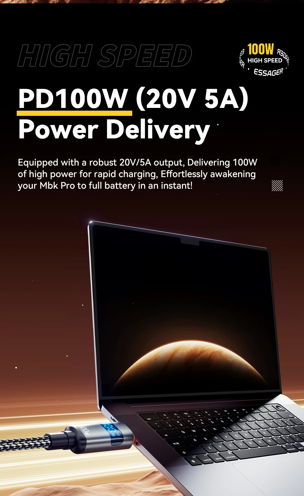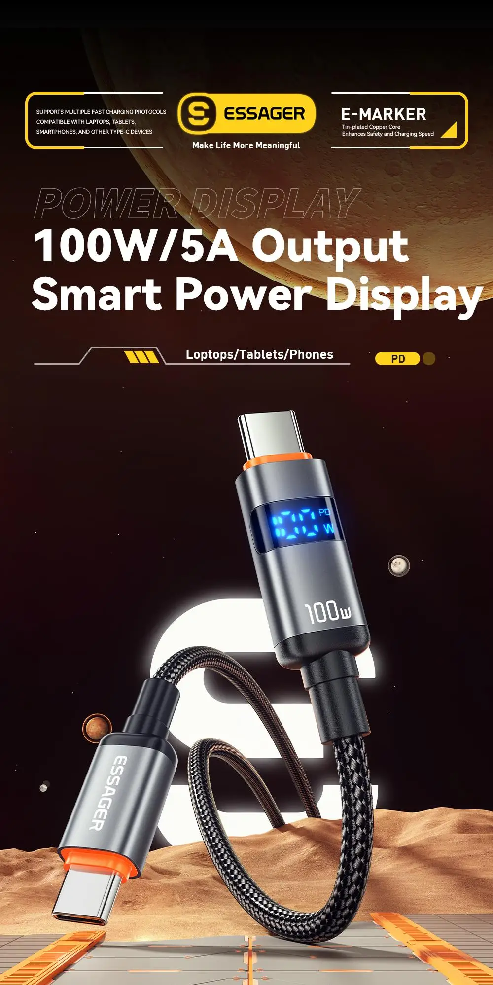 O cabo de carregamento Essager é capaz de fornecer até 100W de potência, permitindo um carregamento extremamente rápido para seus dispositivos compatíveis com PD. Nunca mais se preocupe com a bateria fraca, pois com este carregador de alta potência, você terá seus dispositivos prontos para uso em questão de minutos.