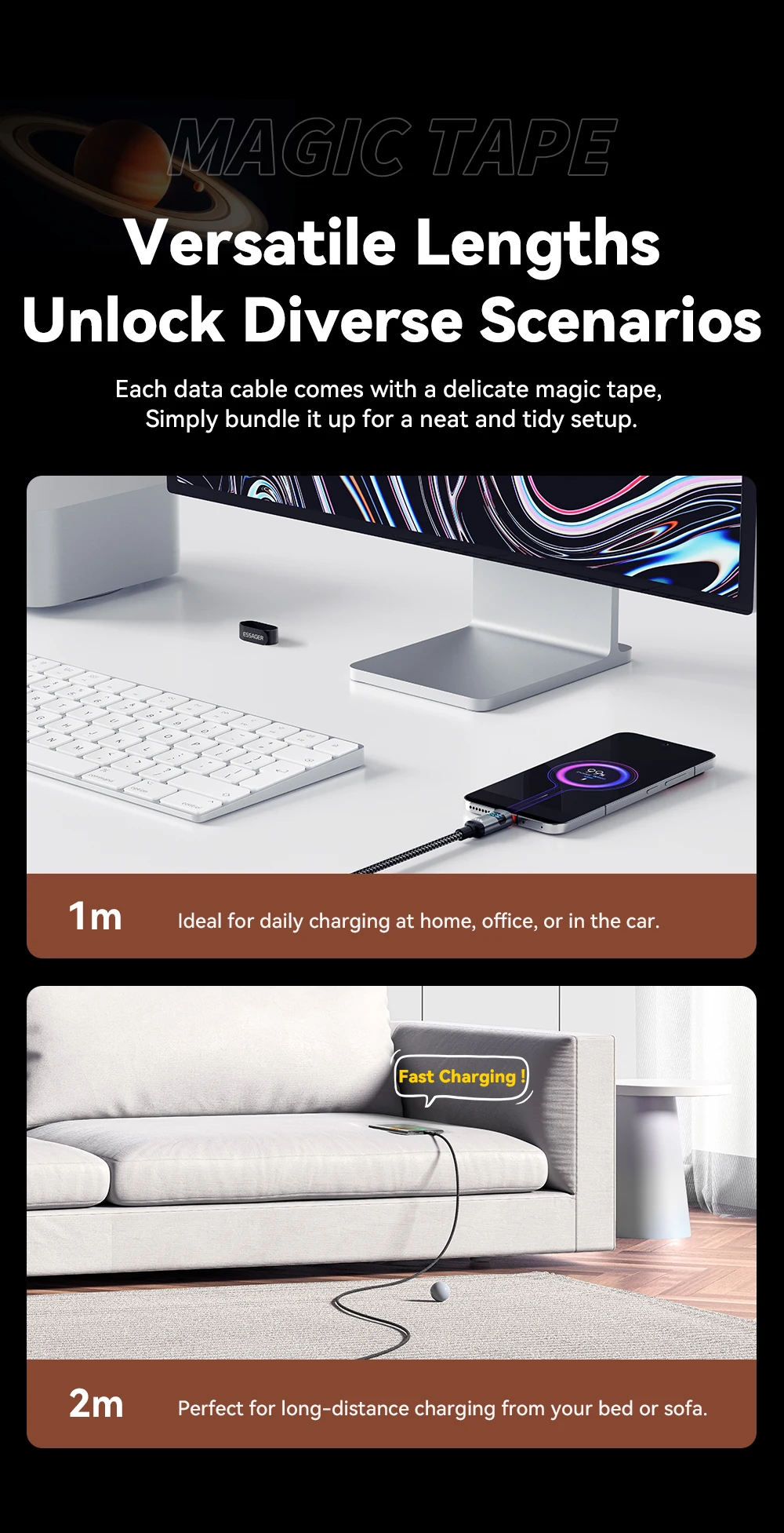 O design elegante e minimalista do Carregador de Carregamento Rápido Essager adiciona um toque de sofisticação ao seu setup. Além disso, o comprimento de 2 metros proporciona maior liberdade de movimento e conveniência durante o carregamento, seja em casa, no escritório ou em qualquer outro lugar.