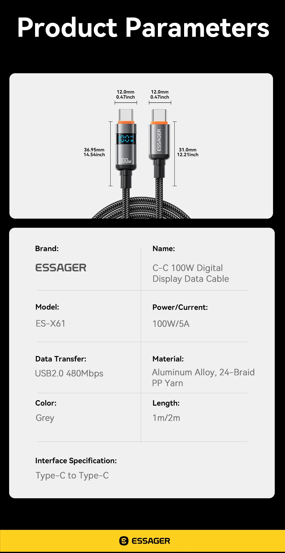 Com 2 metros de comprimento, este cabo de carregamento é feito com materiais de alta qualidade que garantem durabilidade e resistência superiores. Não se preocupe mais com cabos que se desgastam facilmente, pois o Essager 100W PD Tipo C é projetado para resistir ao uso diário e oferecer um desempenho de carregamento excepcional por um longo período.