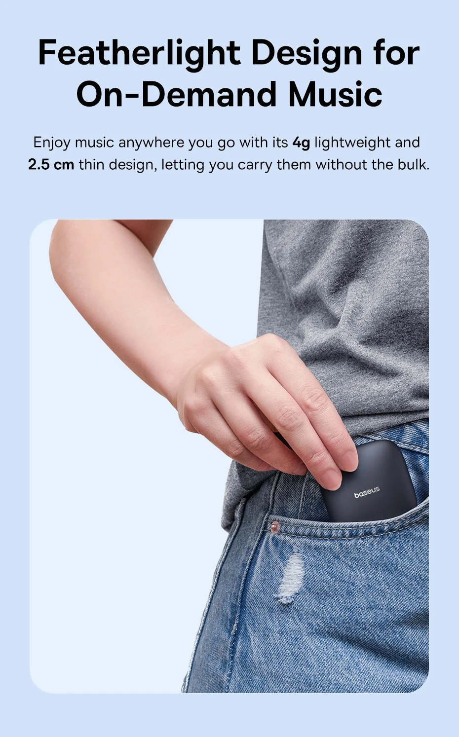 Desfrute de música em qualquer lugar que você vá com seu design leve de 4g e fino de 2,5 cm,