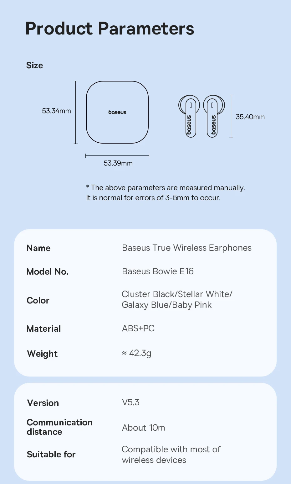 Disponível em uma variedade de cores estilosas, incluindo Preto, Branco, Azul e Rosa, os Baseus Bowie E16 combinam perfeitamente com seu estilo pessoal. O design ergonômico garante um encaixe seguro e confortável, para que você possa aproveitar sua música sem interrupções. Além disso, a tecnologia Bluetooth 5.3 oferece uma conexão estável e de alta qualidade, permitindo que você se mova livremente sem se preocupar com fios.
