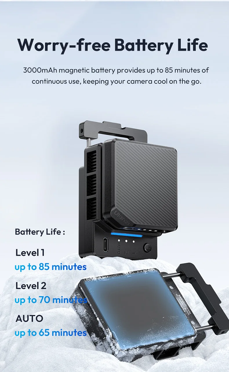 3000mAh magnetic battery provides up to 85 minutes of continuous use, keeping your camera cool on the go.