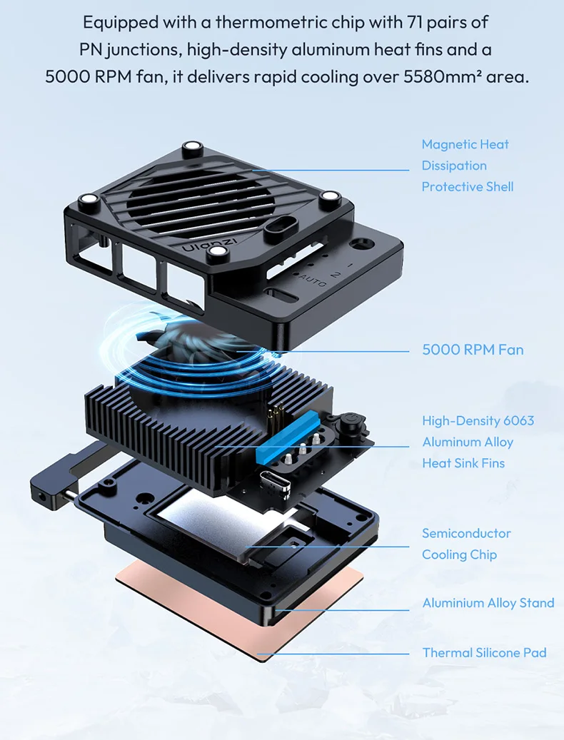Equipped with a thermometric chip with 71 pairs of PN junctions, high-density aluminum heat fins and a 5000 RPM fan, it delivers rapid cooling over 5580mm² area.
