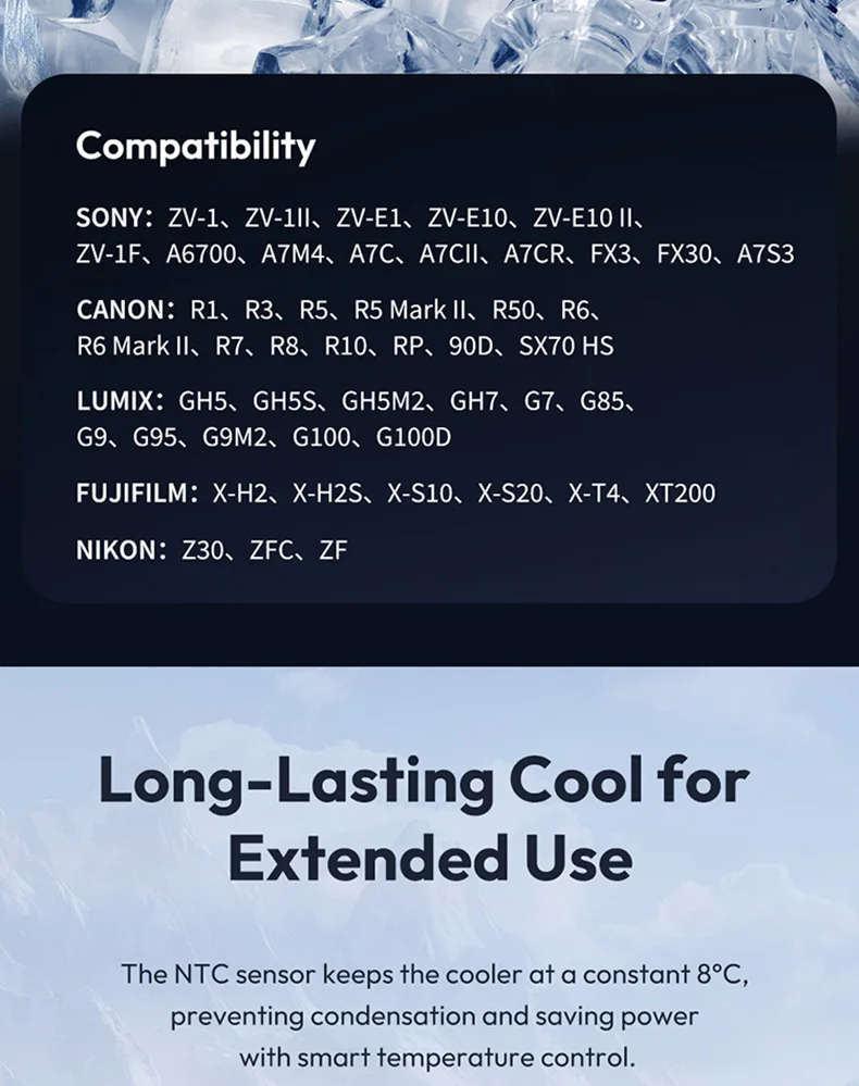 O Ulanzi CU01 é compatível com uma ampla gama de câmeras de transmissão populares, tornando-o uma escolha versátil para criadores de conteúdo de diferentes áreas. Independentemente da marca ou modelo da sua câmera, este refrigerador de câmera estará pronto para mantê-la resfriada e operando com eficiência máxima.